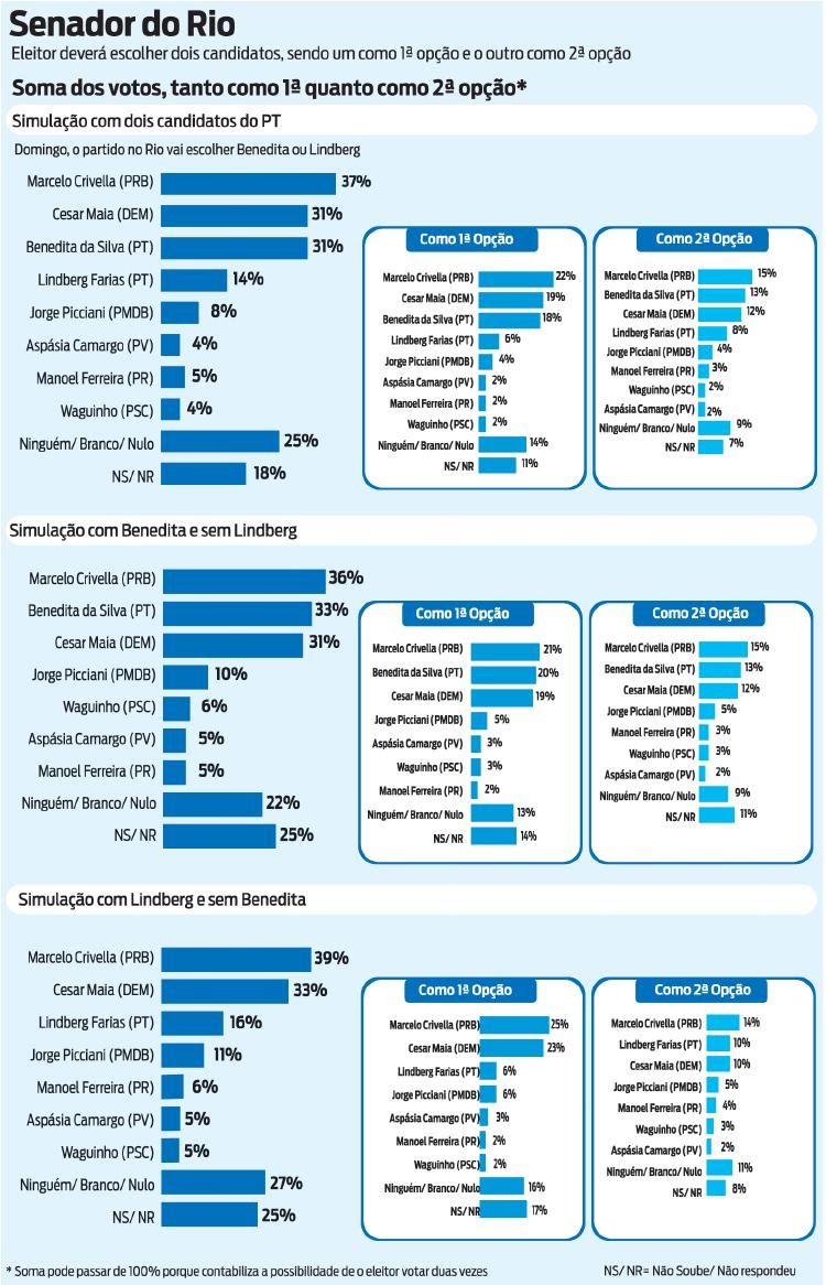 Na corrida pelo Senado no Estado do Rio de Janeiro, em que o eleitor poderá escolher dois nomes, a disputa está bem acirrada, com três pré-candidatos tecnicamente empatados, de acordo com o Instituto Vox Populi, que usou os mesmos critérios que os da pesquisa para governador do Rio. Marcelo Crivella (PRB), Cesar Maia (DEM) e Benedita da Silva (PT) aparecem colados nos diversos cenários da pesquisa, seja na primeira ou na segunda escolha de voto. E na soma das duas, que é o que vale como votação total do candidato. No primeiro cenário, quando foi perguntado para quem o eleitor daria o primeiro voto, Crivella tem 22%, Cesar Maia tem 19% e Benedita, 18%. No segundo cenário foi perguntado para quem seria o segundo voto e o resultado foi parecido. Crivella teve 15%, Benedita, 13%, e Cesar Maia, 12%. A margem de erro é de 3,1%.