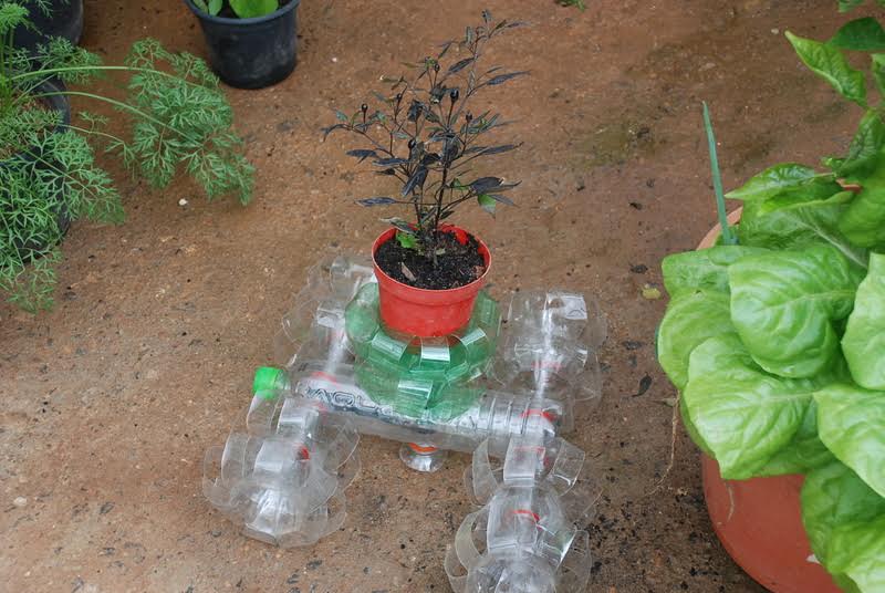 Tudo feito numa área cimentada, com 30 metros quadrados, utilizando diferentes recipientes, para mostrar a possibilidade de plantio em vasos e embalagens recicladas, como garrafas pet.