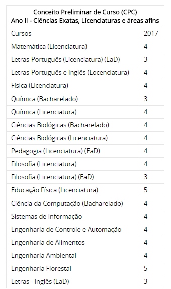 Também foi divulgado nesta terça-feira o Conceito Preliminar de Cursos (CPC), que avalia a qualidade dos cursos de graduação, também em uma escala de 1 a 5. O indicador é calculado com base no desempenho dos estudantes no Enade, no valor agregado pelo curso ao desenvolvimento dos estudantes concluintes, no perfil do corpo docente e nas condições do processo formativo. Foram avaliados cursos de Ciências Exatas, Licenciaturas e áreas afins.