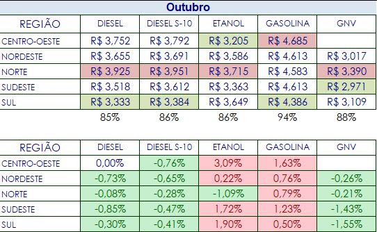 “Podemos observar que o preço do diesel apresentou queda em todas as regiões brasileiras, tendo a maior baixa na Região Sudeste, em que o combustível ficou 0,85% mais barato do que em setembro. Já o Centro-Oeste figurou com o maior recuo para o diesel S-10, com o litro 76% mais barato nas bombas da região”, acrescenta Douglas Pina.