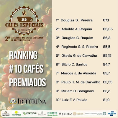 O município de Ibituruna, no último sábado (26) foi palco de uma importante celebração de cafés especiais, que destacou os produtores mais bem avaliados, com base nas melhores notas sensoriais, e reforçou a relevância dos cafés cultivados em nosso município.